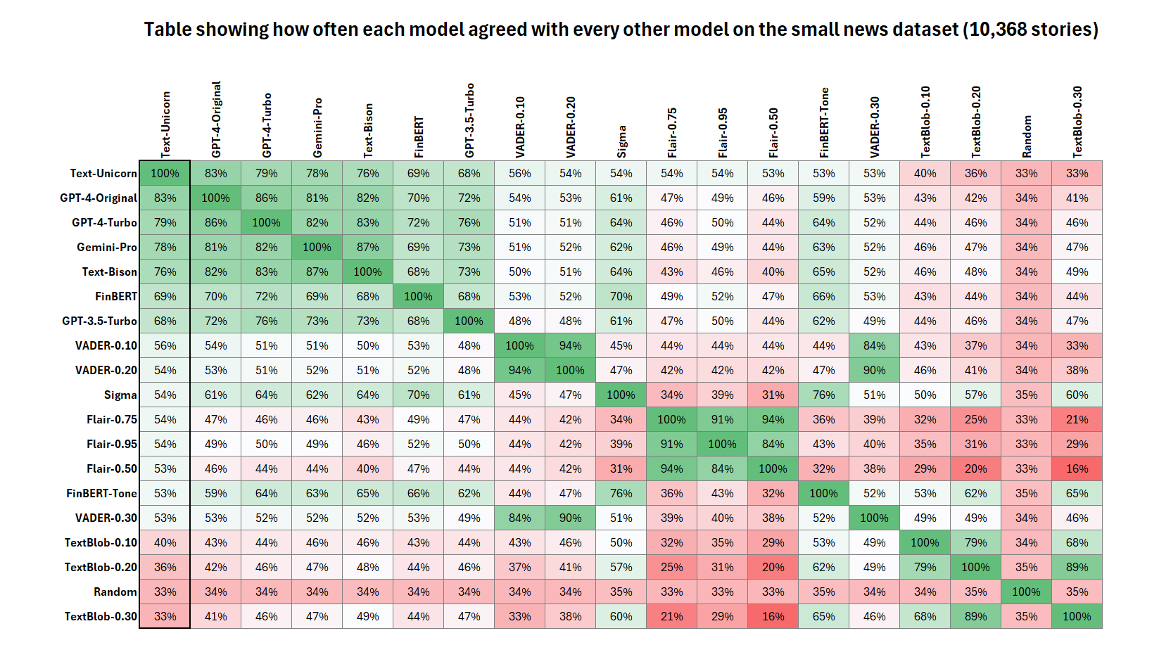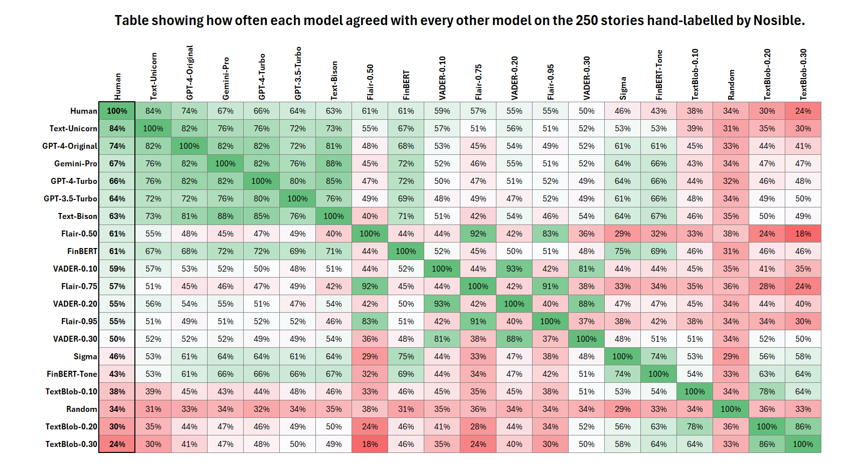 - First place went to the Unicorn PaLM-2 LLM from Google. It assigned the same sentiment as we did an incredible 84% of the time!