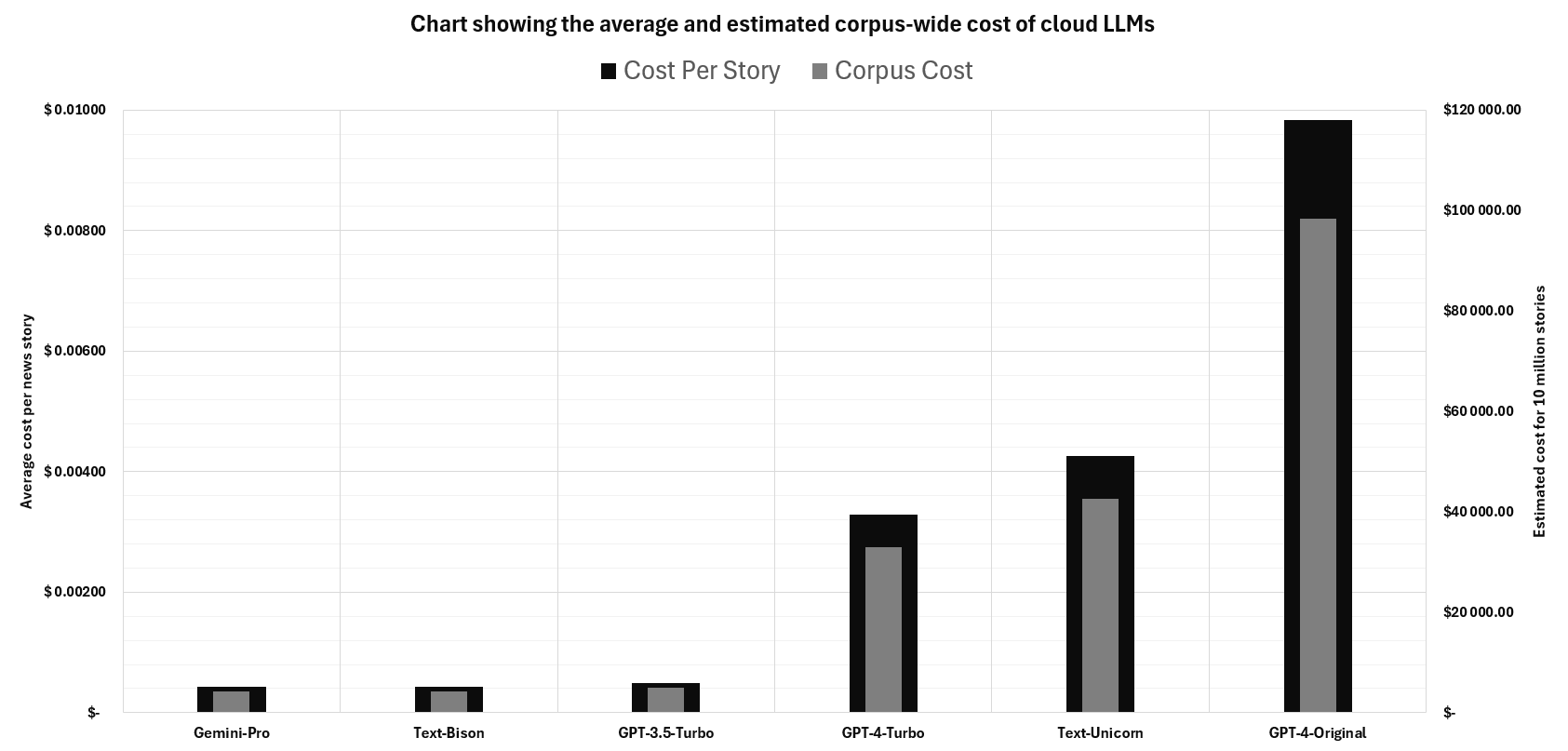 The bar chart below shows the average cost incurred per news story labeled as well as the estimated total cost incurred if we used that model to label 10 million news stories (our corpus contains more documents than this already btw 🫢).